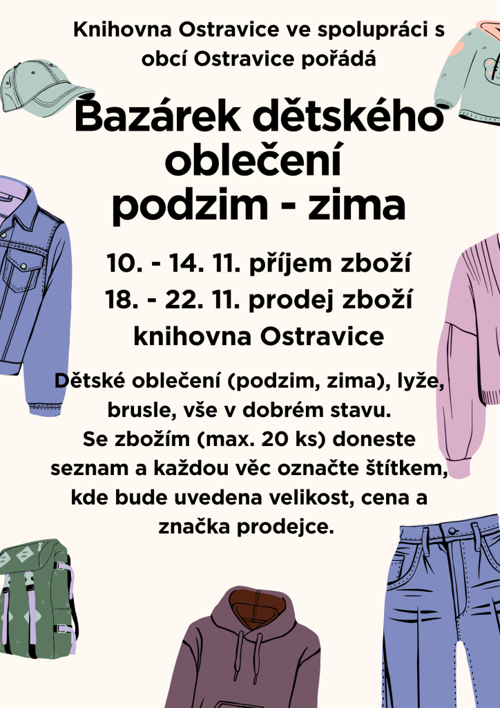 Věci vyprané a opravdu v dobrém stavu můžete nosit od pondělí 10. 11. do 14. 11. 2025. Se zbožím max. 20ks doneste seznam a každou věc označte štítkem, kde bude uvedena velikost, cena a značka prodejce.