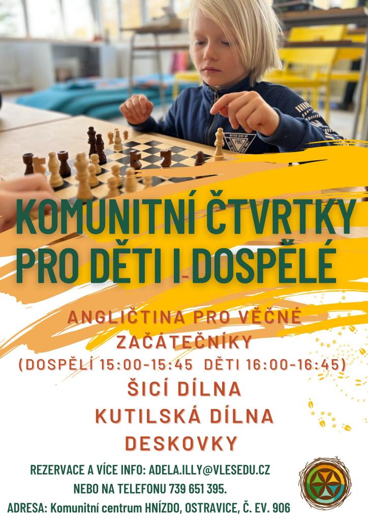 Velkou novinkou jsou KOMUNITNÍ ČTVRTKY, kdy vás chceme nalákat, abyste k nám jezdili na angličtinu, děti na deskovky, pokud máte v okolí babičku, tetičku, která ráda šije, ale nemá doma šicí stroj, určitě ji o nás řekněte. To samé platí o domácích kutilech, kteří by třeba rádi využívali jednou týdně naši kutilskou dílnu.